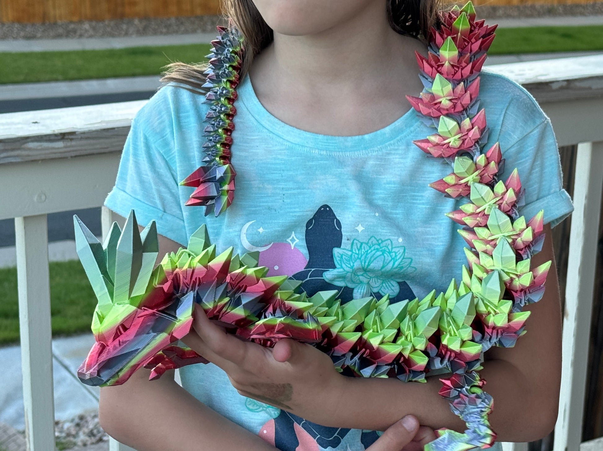 This one-of-a-kind dragon is HUGE, printed in high-quality Ambrosia Silk Rainbow filament, and has a metallic look to it.
