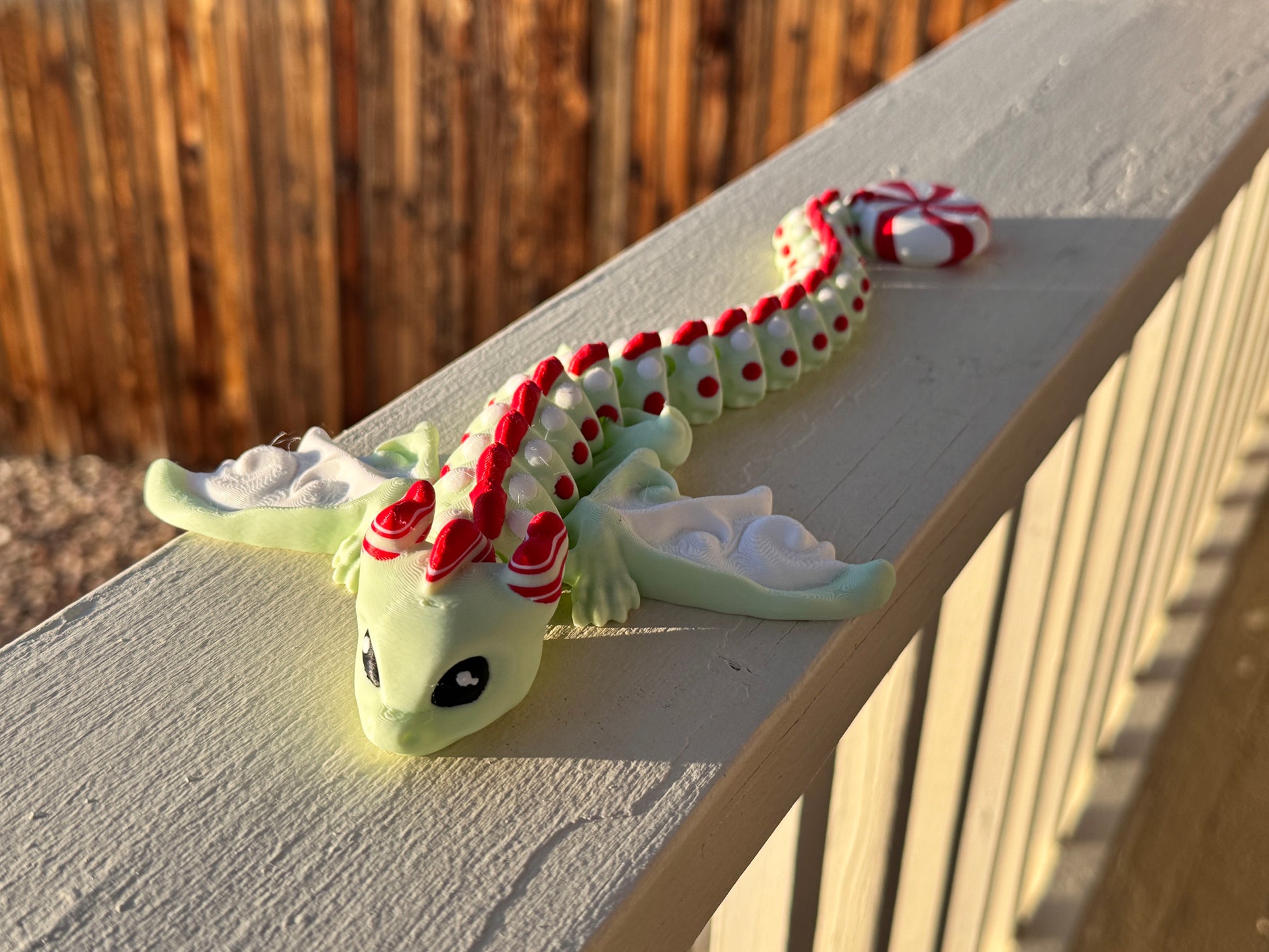 Unleash the holiday spirit with the Peppermint Dragon by Teal Cat Creative. This 3D printed articulated dragon features a fun peppermint design, perfect for adding a touch of Christmas cheer to any space. Cute, quirky, and full of personality, this dragon is a must-have for any festive decor and/or dragon lover.