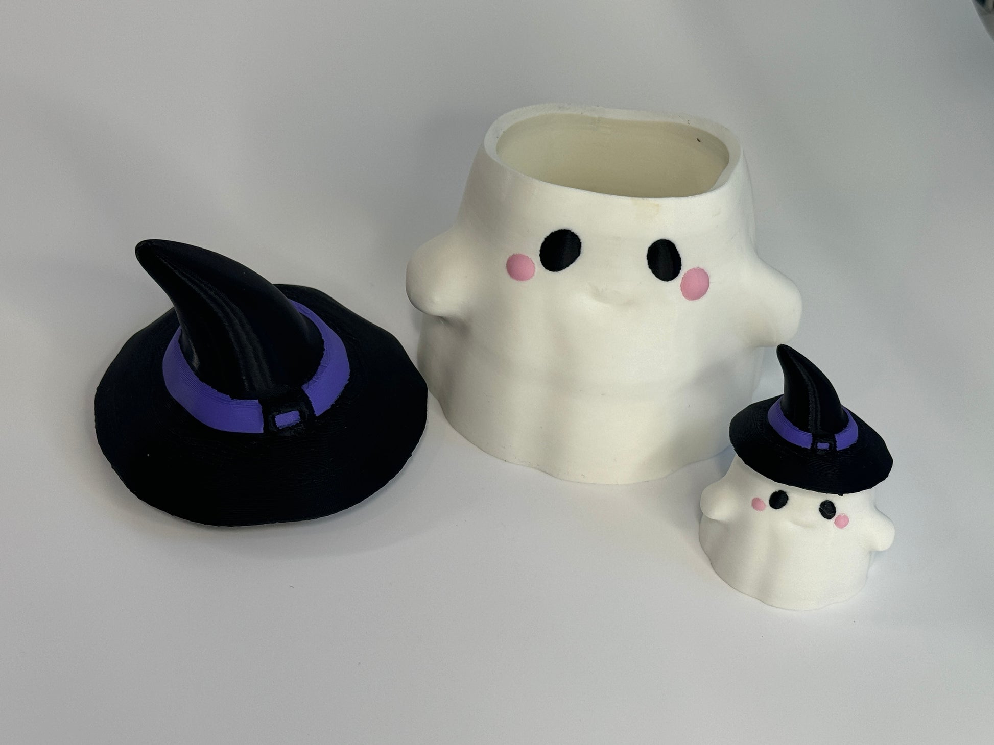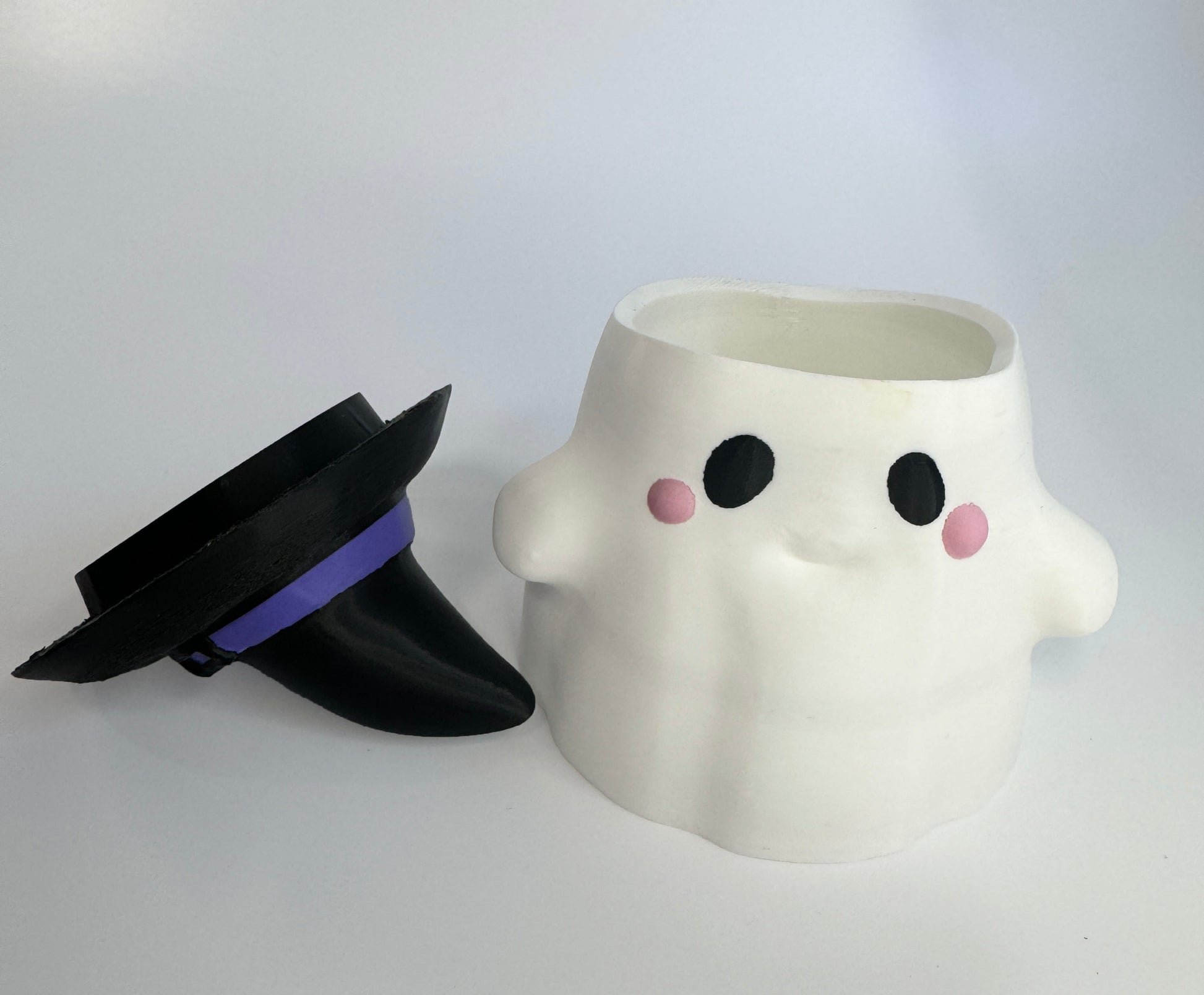 Keep your belongings safe and spooky with our Teal Cat Ghost Container! Shaped like a ghost wearing a witch hat, it's perfect for storing treats (or tricks). No need to be afraid, our ghost is here to add a playful touch to your storage solutions.